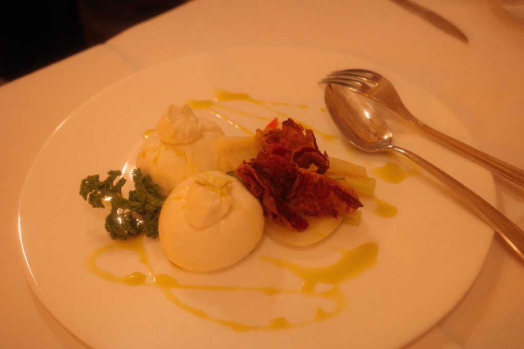 - 前菜 – 脆皮乳豬:這道超級驚喜!豬肉又嫩又甜,感覺加了不少蜂蜜去烤。搭配紅酒蘋果醬(Aglianico)非常解膩。上面放了一種叫 Puntarelle 的蔬菜(脆甜的菊苣嫩芽),微微的苦味跟豬肉的甜味很搭。