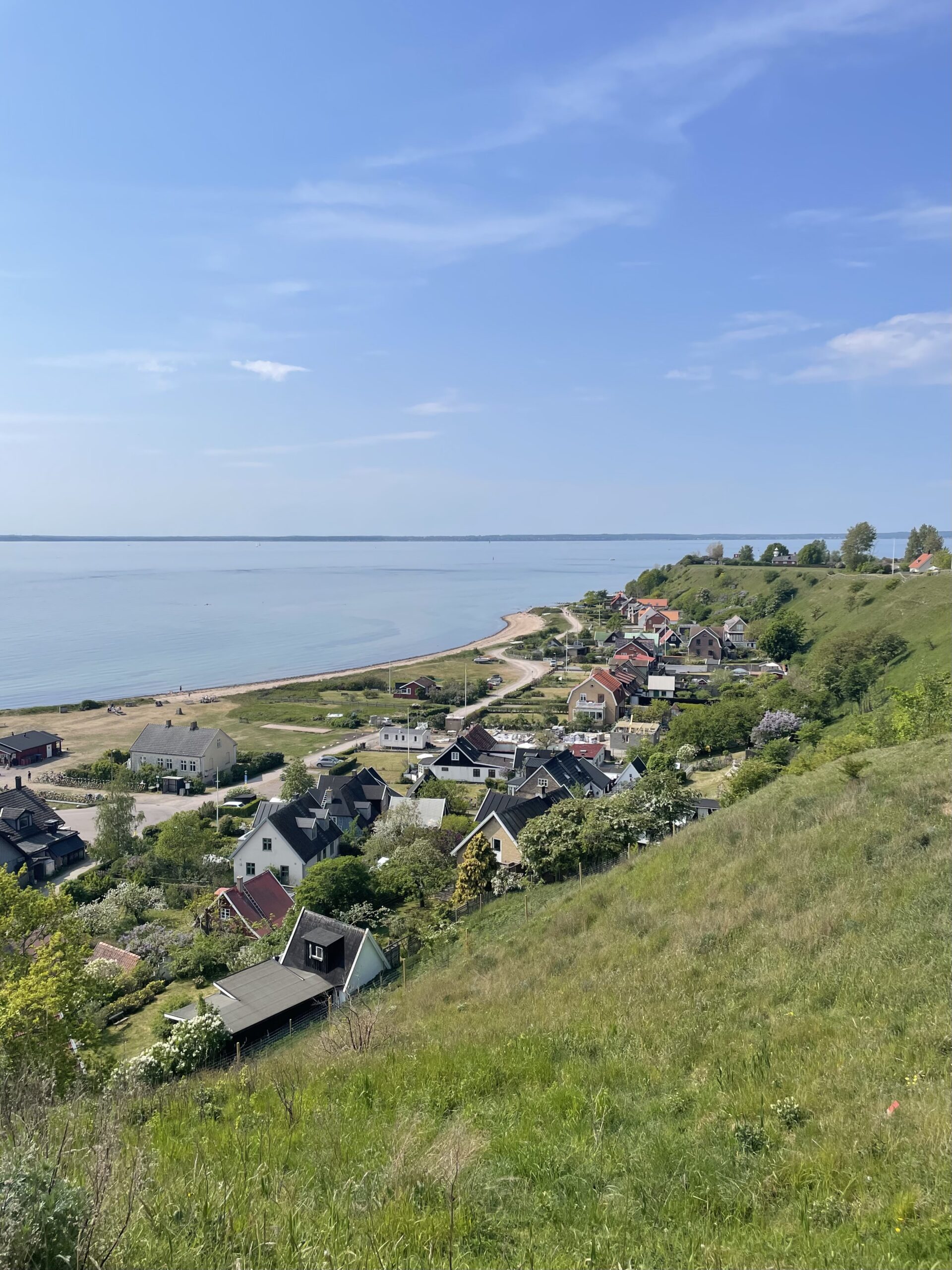 面向海邊左側的小屋是錯落的。右側則是一整排,還可以看到連接丹麥與瑞典的松德海峽大橋。看夕陽時,隱約能看到的橋和風力發電機,加上淡紫色的天空十分浪漫!